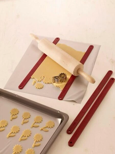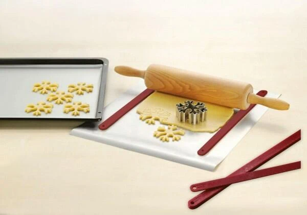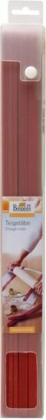 Mit diesen Stäben lässt sich Plätzchenteig optimal ausrollen. Gewählt werden kann zwischen drei verschiedenen Ausrollhöhen, da das Set insgesamt sechs Stäbe in drei Höhen enthält. So können sehr dünne, aber auch dickere Kekse gebacken werden. Die Teigstäbe sind aus lebensmittelechtem Nylon gefertigt und werden mit einem Sicherungsband während der Aufbewahrung zusammengehalten.