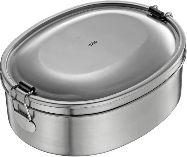 Robuste Lunchbox von cilio aus satiniertem Edelstahl. Stilvoll, praktisch und gesund unterwegs.