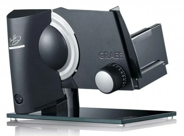 Hochwertige Schneidemaschine für das Schneiden von dünnen bis sehr dünnen Scheiben in der Johann Lafer Edition. Inklusive Mini-Slice-Aufsatz, Diamant-Messerschärfer D-1000, Edelstahltablett, Kochschürze und Rezeptheft. Made in Germany!