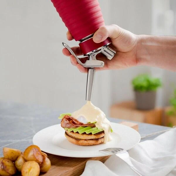 iSi Gourmet Whip ist das multifunktionale Aufschlaggerät für die Profianwendung in der Küche. Zur Zubereitung von locker-leichten Espumas, Fingerfood, warmen und kalten Saucen, aufgeschlagenen Cremesuppen, sowie Schlagsahne und Desserts.