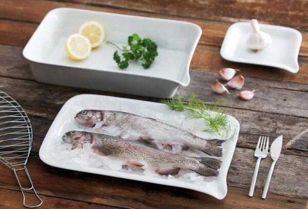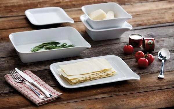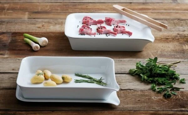 Zum Backen und Dünsten im Ofen gibt es die Kahla Backformen Five Senses in insgesamt drei Größen. Bei allen Gefäßen ist eine Ecke so geformt, dass sich überschüssige Flüssigkeit abgießen und Sauce ausgießen lässt.