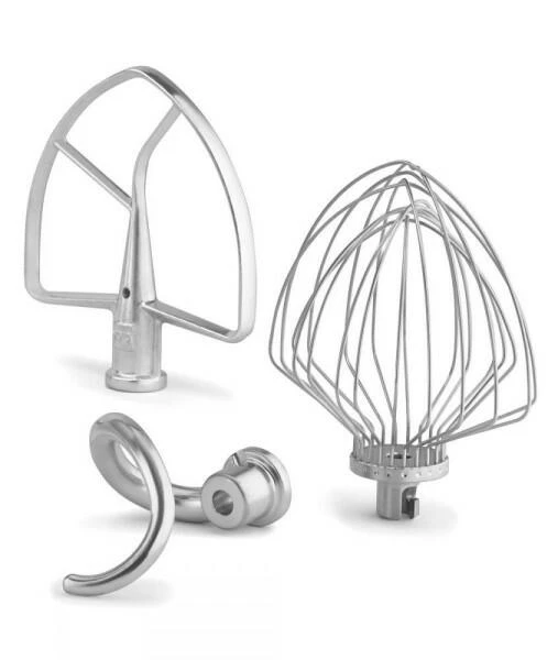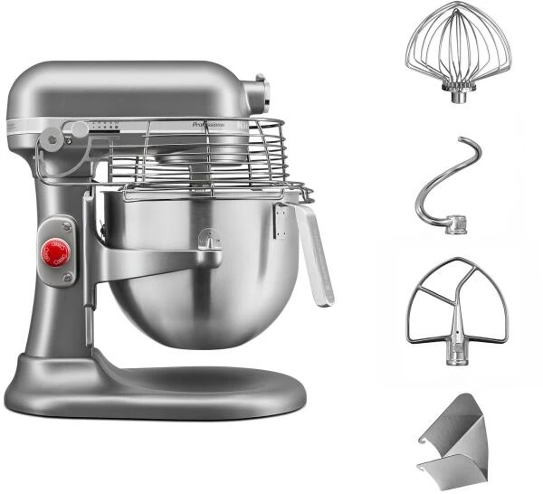 - Standardzubehör (im Lieferumfang enthalten): 6,9 L Schüssel aus gebürstetem Edelstahl, Spritzschutz, elliptischer Schneebesen mit 11 Drähten aus Edelstahl, Knethaken aus Edelstahl, Flachrührer aus Edelstahl, abnehmbare Einfüllschütte