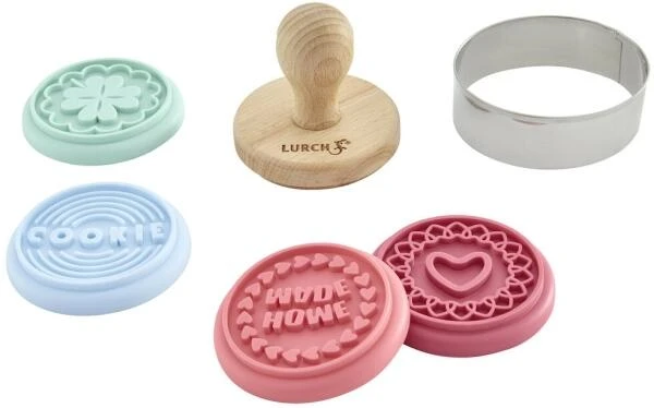 Lurch Keksstempel Set Home 6teilig Pastel Mix. Keksstempel Set bestehend aus einem Stempel, einem Ausstechring und vier Stempeleinsätzen aus Silikon.