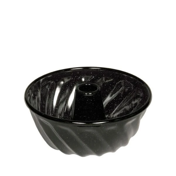 Riess Gugelhupfform aus Emaille in schwarz. Die Backform mit Bördelrand ist in 3 Größen erhältlich. Schwarzemaille ist besonders langlebig und mit porenloser Oberfläche besonders glatt.