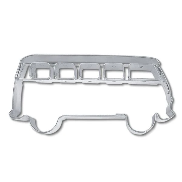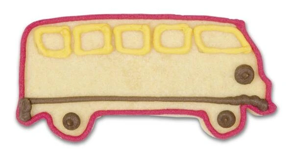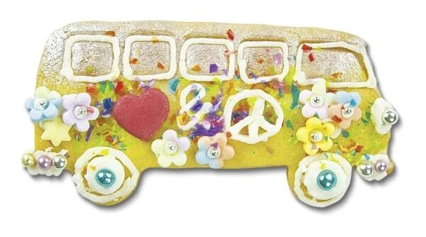 Wer kennt ihn nicht – den Bulli? Backen Sie sich einen Bus und verzieren Sie ihn standesgemäß mit Friedenszeichen, Blumen und anderen Hippie-Symbolen.