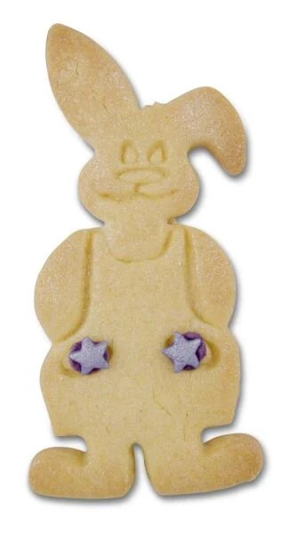 Der Hasenbub steht mit verschränkten Armen, geknicktem Ohr und einem fröhlichen Gesicht da. Dank Vorprägung wird das alles schon beim Ausstechen angelegt.