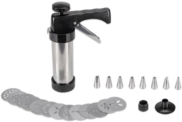 Mit diesem Multitalent bleiben keine Wünsche offen. Ganz einfach und schnell zaubern sie leckeres Spritzgebäck in bis zu 13 verschiedenen Motiven. Zudem können sie mit den 8 Garniertüllen Cupcakes und Torten mit Icing, Frosting oder Buttercreme verzieren.